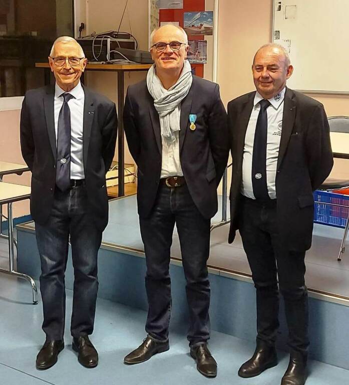 Hervé OZO et Noël BLEU ont remis au Président Denis LEBRETON la médaille de bronze des Médaillés de la Jeunesse des Sports et de l’Engagement Associatif.
